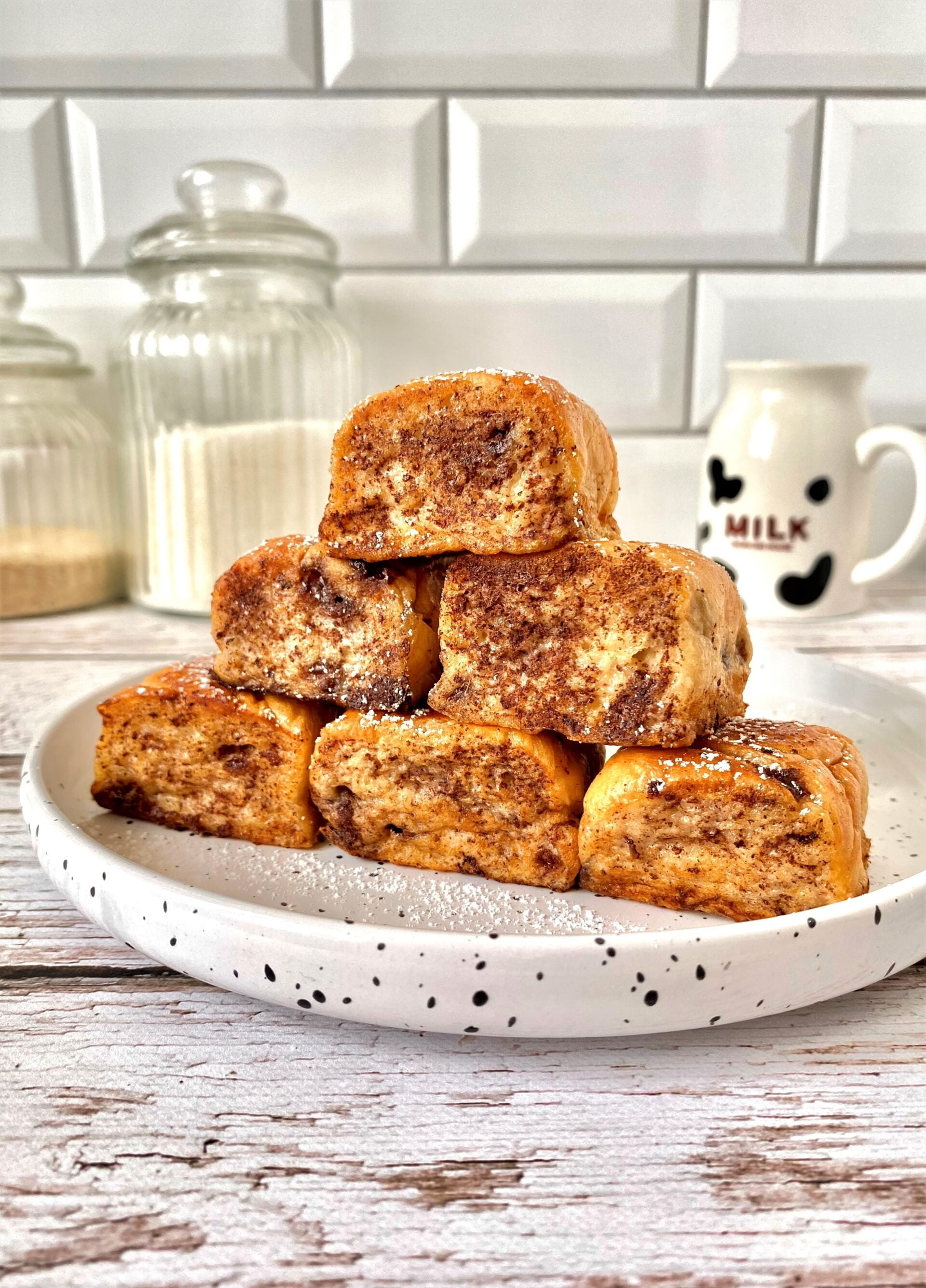 Do miseczki wlewam mleko, rozbijam jajko, wrzucam cukier i cynamon. Jajko roztrzepuję i wszystko dokładnie ze sobą mieszam. Bułeczkę maślaną kroję na pół, odcinam jej brzegi, moczę w mleku i smażę na maślę z każdej strony. Podaję z cukrem pudrem.
