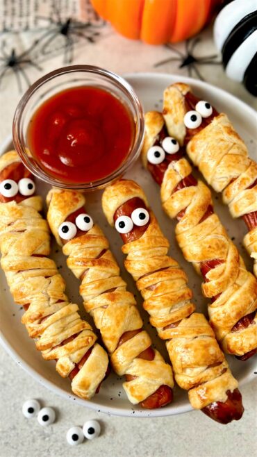 Halloween już jutro! Czasu niewiele dlatego podrzucam Wam super pomysł na extra halloweenową przekąskę! 🎃 Tym razem zrobiłam mumie z ciasta francuskiego, w środku z …