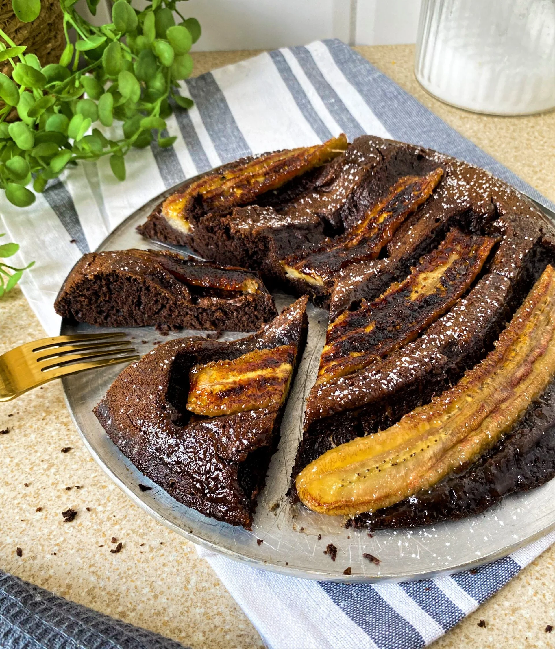 Rozbijam jajko, dodaję cukier, olej, mleko, mąkę, kakao i proszek. Wszystko razem dokładnie mieszam. Na patelni roztapiam masło, posypuje cukrem i układam przekrojone banany. Smażę przez chwilę i wylewam masę. Ciasto smażę pod przykryciem przez ok 15-20min, aż wierzch będzie suchy. Posypuję cukrem pudrem i gotowe!
