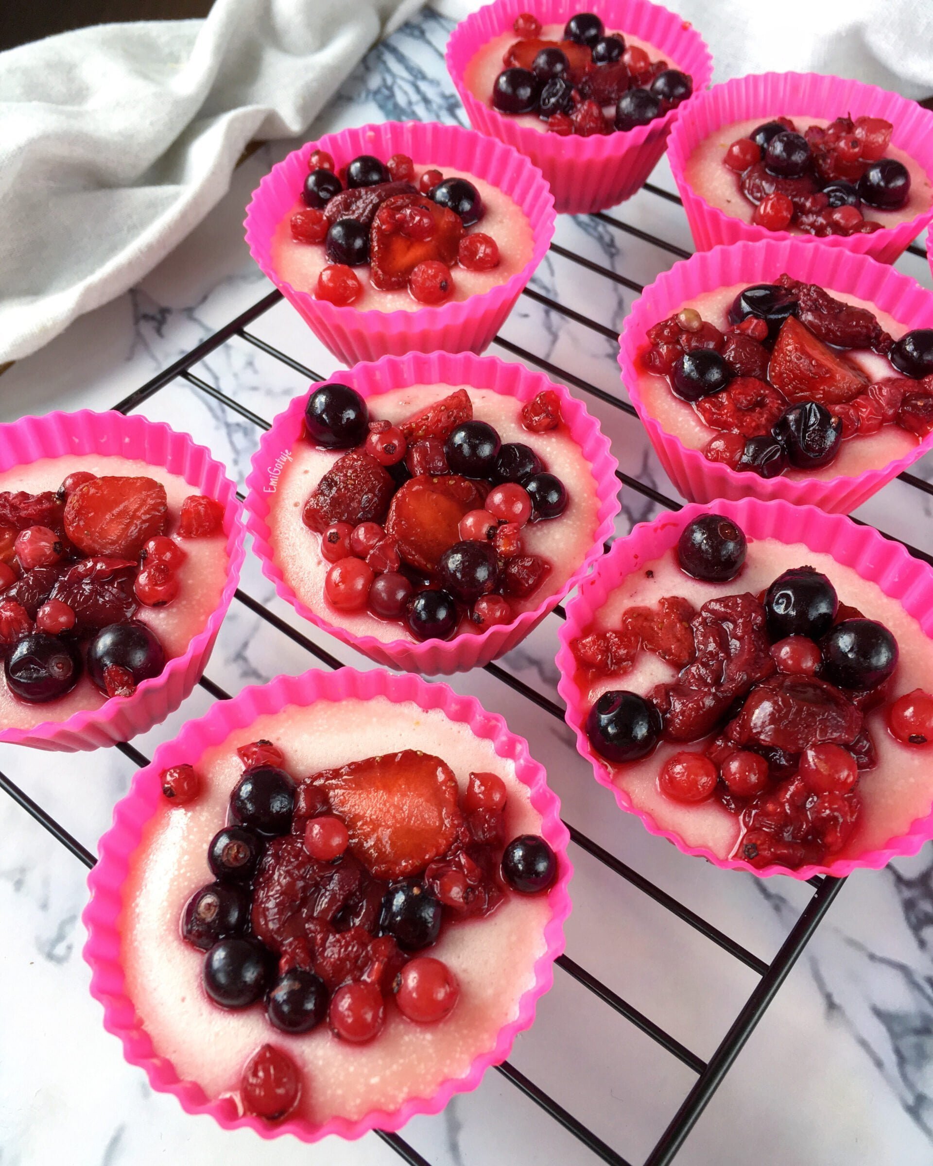 Dzisiaj zapraszam na szybki przepis na wyjątkowo smaczne mini serniczki z owocami leśnymi. Ostatnio stwierdziłam, że nie mam ochoty po raz kolejny piec całej blachy ciasta, a zjadłabym jakiś mały deser, więc wpadłam na pomysł z mini serniczkami. Są bardzo pożywne, z dużą ilością białka, a więc świetne po treningu czy jako przekąska w ciągu dnia. Bez problemu je spakujemy do pudełka i zabierzemy ze sobą! Postawiłam na owoce leśne, ale inne dodatki też świetnie się sprawdzą. Zapraszam!