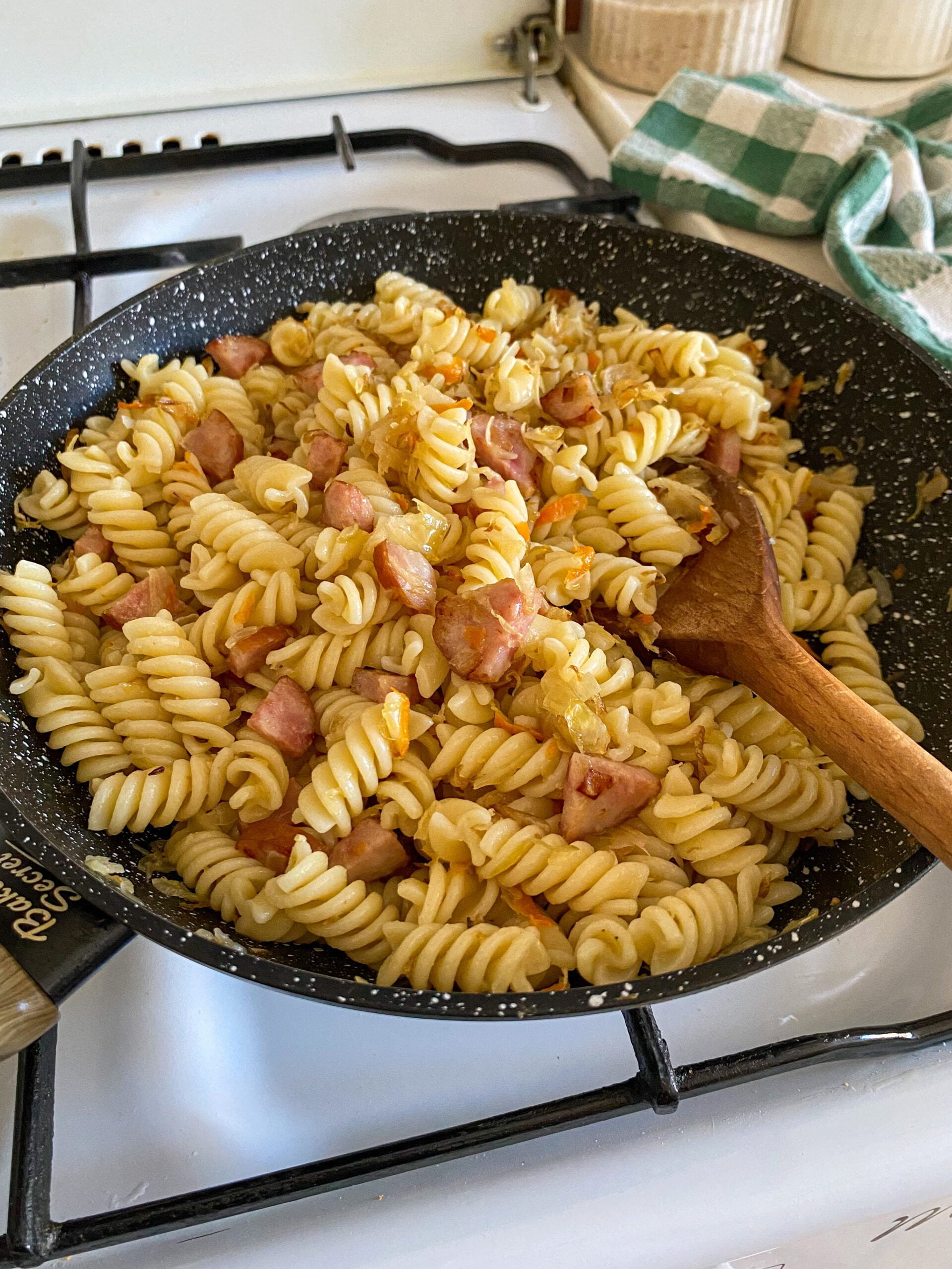 Na rozgrzanym oleju podsmażam cebulkę z kiełbasą a osobno smażę kapustę. Jak kapusta zmięknie po ok 20 minutach smażenia to łączę wszystko razem. Doprawiam do smaku, trochę pieprzu i soli (z solą trzeba uważać! wszystko zależy od tego jak słona jest kapusta), dodaje też kminek. Do kapusta dorzucam ugotowany makaron i gotowe!