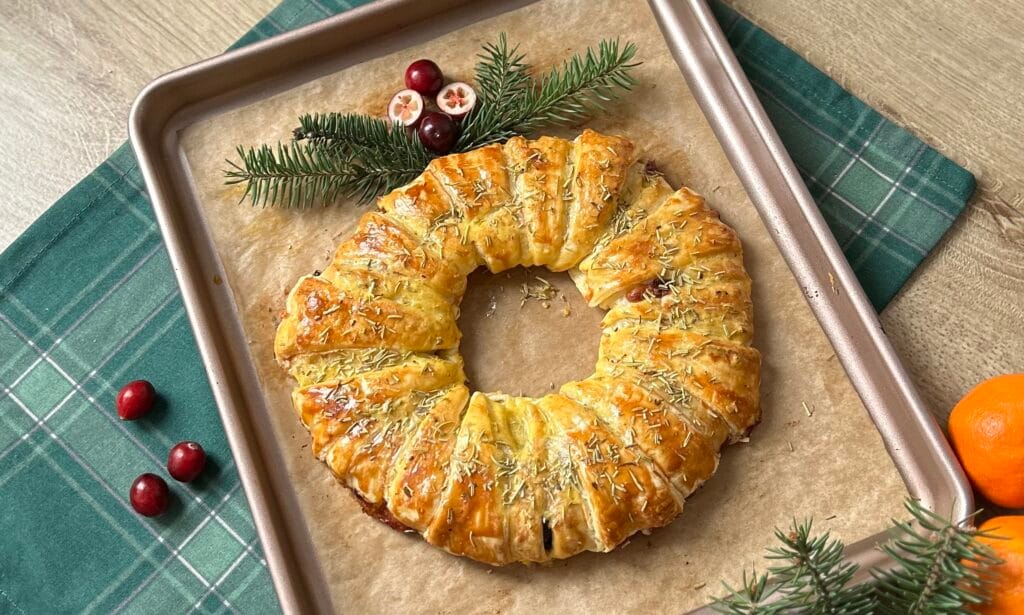Wieniec z ciasta francuskiego z serem Brie i żurawiną to idealna propozycja na Sylwestra, imprezę domową lub świąteczne spotkanie. Połączenie chrupiącego ciasta, kremowego sera pleśniowego i słodko-kwaśnej żurawiny smakuje obłędnie i wygląda naprawdę efektownie ✨ To przekąska typu finger food, którą możesz postawić na stole zamiast klasycznych kanapek – znika w kilka minut!